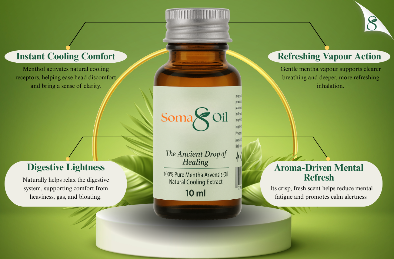 SOMA Mentha is a 100% natural mentha concentrate crafted to relieve acidity, headaches, heaviness, and mental fatigue. Steam-distilled using traditional methods, it delivers powerful cooling and refreshing relief in just a few drops.